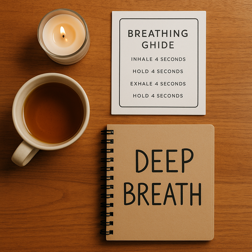 - 박스 호흡법: 4초 들숨 → 4초 멈춤 → 4초 날숨 → 4초 멈춤. 집중력과 안정감 향상에 좋습니다.